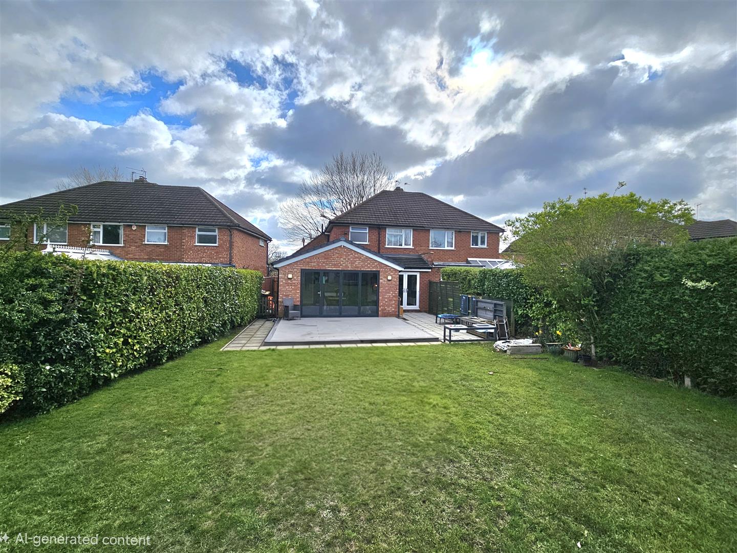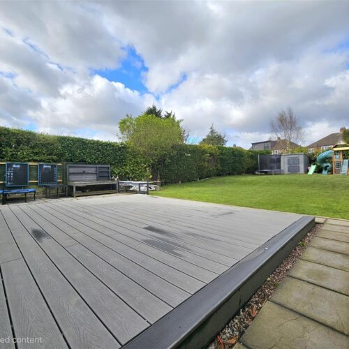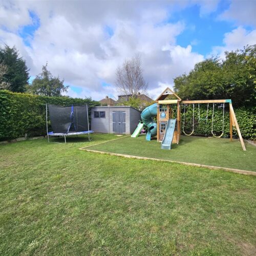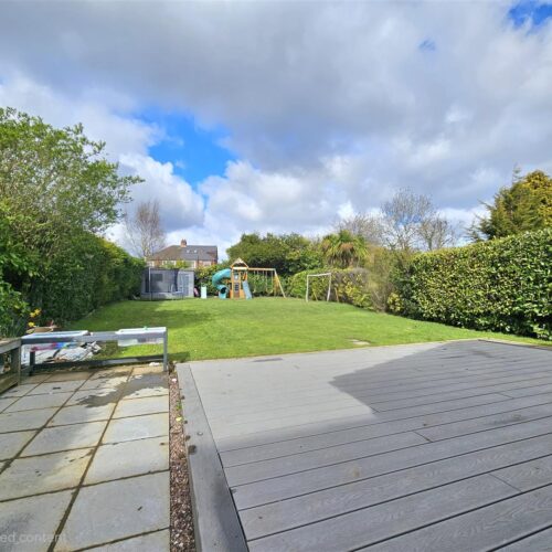 To the rear we have a generous garden with patio and decking area leading to a large lawn bordered by mature shrubs with garden shed and children's play area with artificial turf.