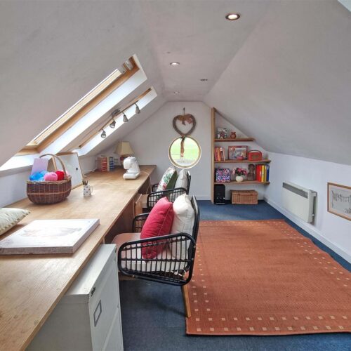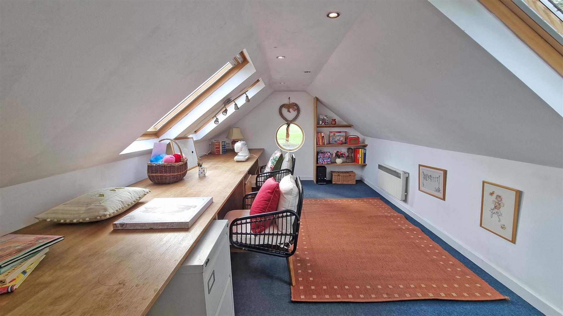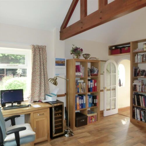 Set back from the road via a walled mature front garden and side driveway with ample parking and access to the detached double garage with work shop, mezzanine office and store.