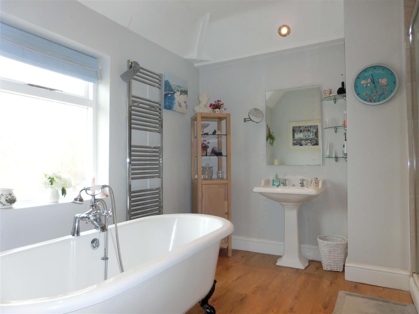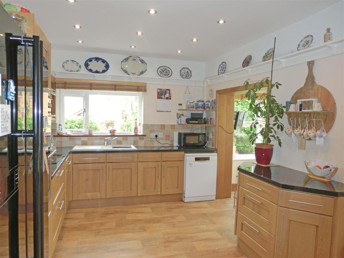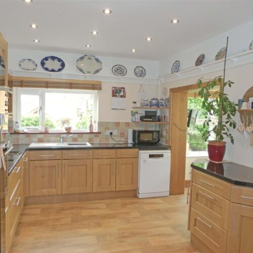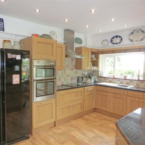 Being refitted with a traditional range of oak fronted wall, drawer, larder and base units with granite effect work surfaces over incorporating ceramic sink and drainer with mixer tap, halogen hob with extractor over and double eye level oven, space for American style fridge freezer and dishwasher, ceramic wall tiles, heated towel rail, recessed ceiling spot lights, double glazed window to the side, door to the utility and open access to the breakfast area with double glazed windows to the rear garden and recessed ceiling spot lights
