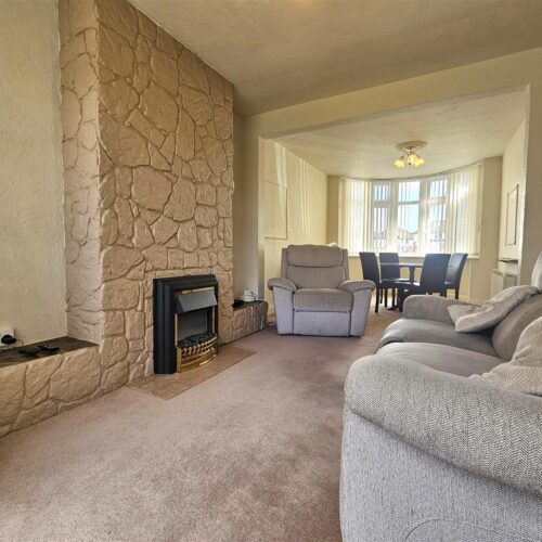 This semi-detached property is set back on a service road behind a deep set driveway affording parking for multiple vehicles leading to the accommodation which comprises of entrance porch, entrance hall, open Plan through living/Dining Room with bay window and glazed sliding doors onto the rear garden, fitted kitchen with integrated appliances and under stair storage, covered side passage allowing front and rear access.
