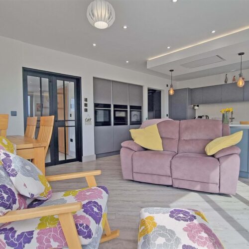 Composite part glazed doors open into the hallway with open access to the spacious lounge with staircase to the first floor accommodation, there is a guest cloaks WC and double glazed doors to the superb modern kitchen dining family room with beautiful open views, bespoke fitted kitchen with granite worksurfaces and central island, a comprehensive selection of integrated applicances and utility.